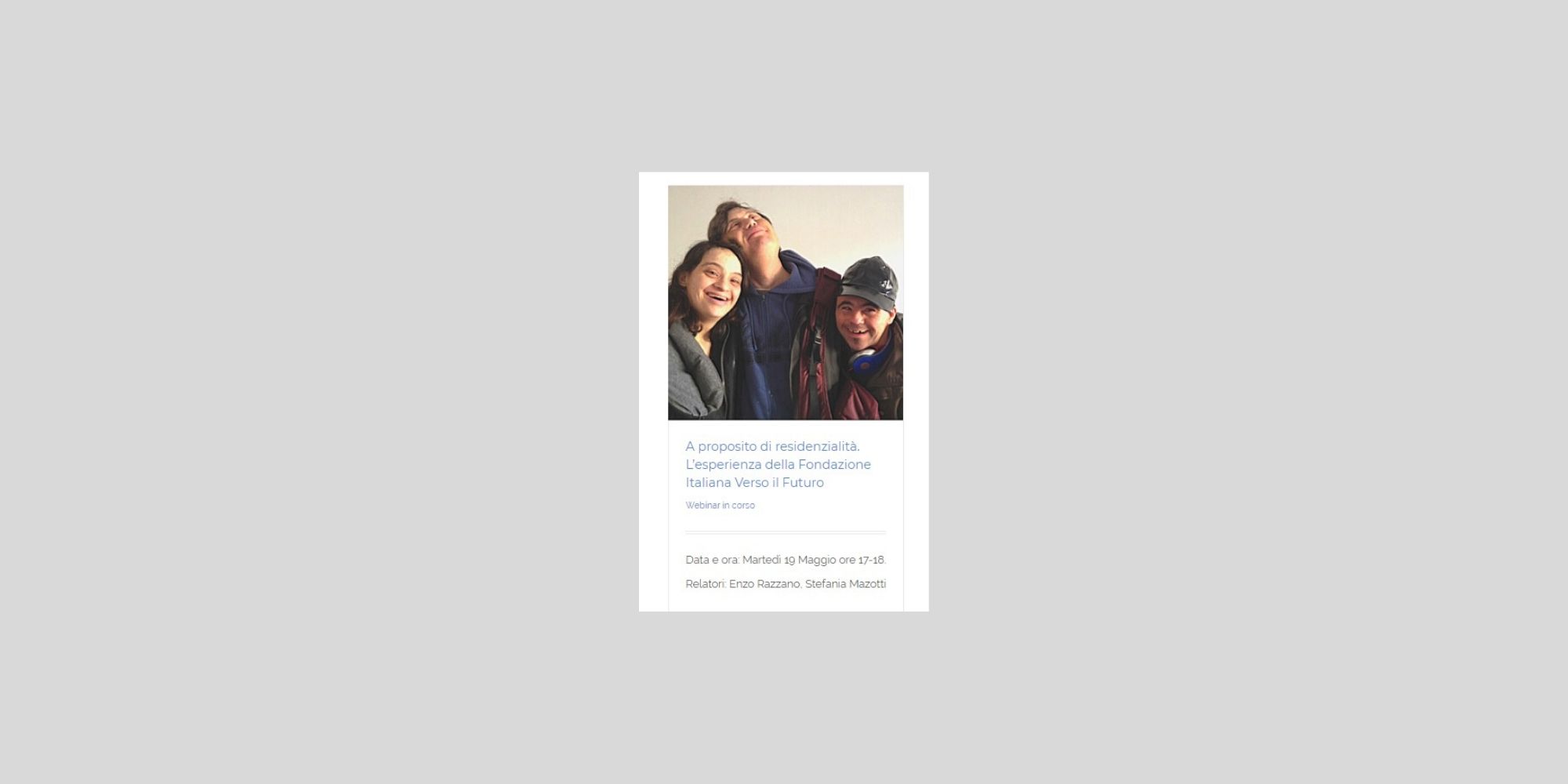 Il primo appuntamento è per le 17 di martedì 19 maggio con l’incontro “A proposito di residenzialità. L’esperienza della Fondazione Italiana Verso il Futuro“. Verranno illustrate le esperienze di case famiglia avviate dalla Fondazione dal 1999 in poi e del percorso che è necessario fare per avere una certa garanzia di successo dell’inserimento. Si parlerà poi della necessità che i genitori preparino il “dopo di noi” nel “durante noi”. Saranno, infine, illustrati i costi che una residenzialità in un piccolo nucleo comporta e le caratteristiche della Legge 112/2016 e delle prospettive che può offrire. Ad accompagnarci in questo percorso saranno Enzo Razzano, presidente della Fondazione Italiana Verso il Futuro e Stefania Mazotti, coordinatrice della Fondazione.