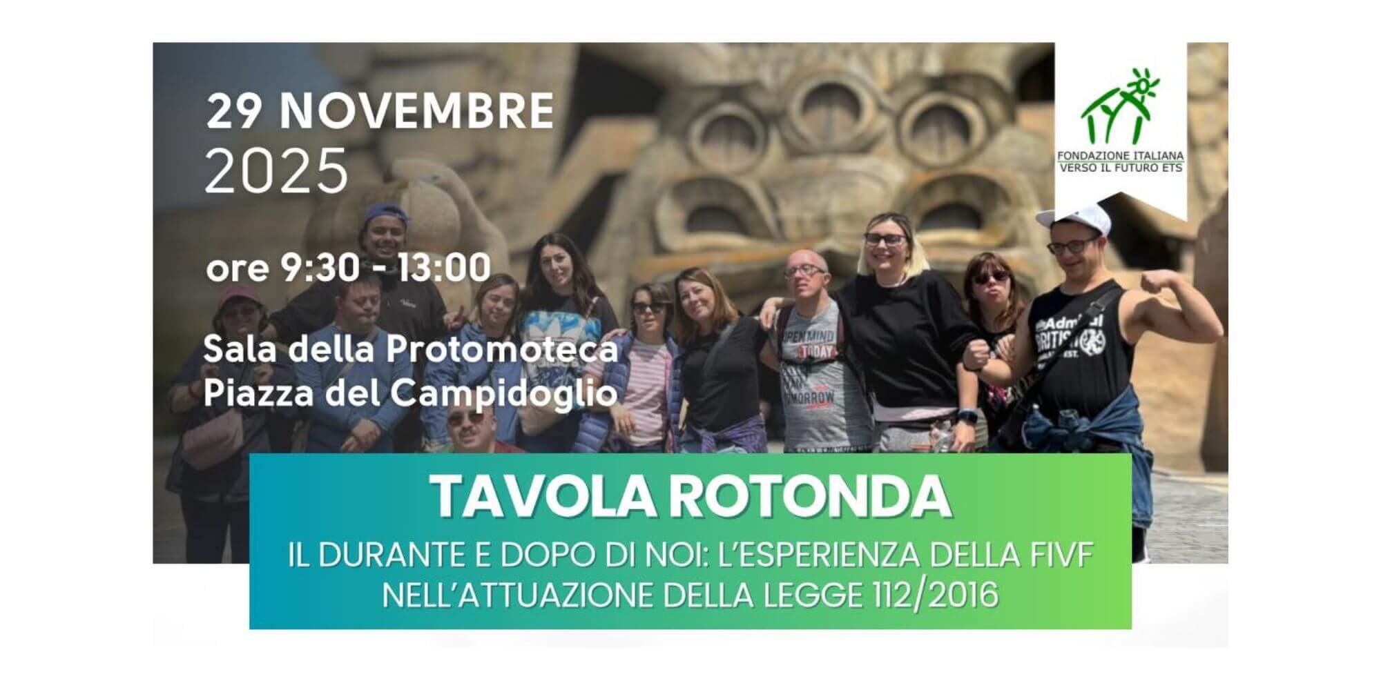 E’ in programma sabato 29 novembre 2025, dalle 9 alle 13 alla Sala della Protomoteca in Campidoglio, la Tavola Rotonda “Il Durante e Dopo di Noi: l’esperienza della Fondazione Italiana Verso il Futuro nell’attuazione della Legge 112/2016”.